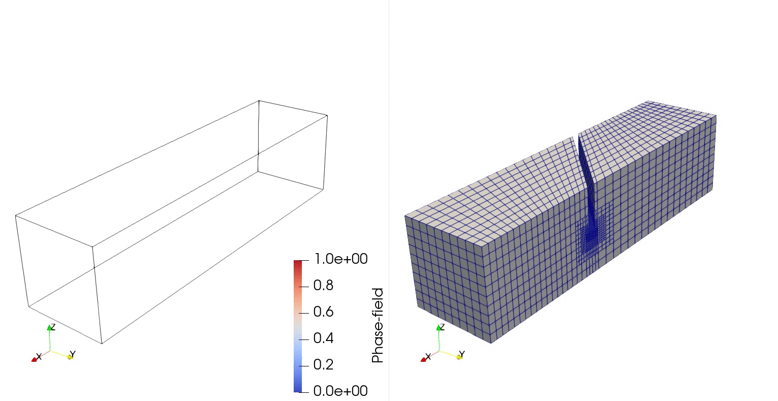 Fig 2. Crack propagation inside a concrete beam under torsion. The crack surface represented by the phase-field is non-planar.